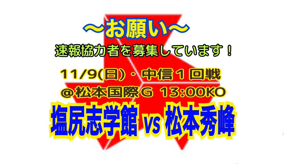 【新人戦・速報協力のお願い】 🚨以下、速報が難しい状況。 速報にご協力頂ける方を探しています🔍 どうぞよろしくお願い致します🙇♂️ ★11/9(日)★ ◆北信1回戦・11:45KO @須坂市北部運動広場 中 野 西 vs 長野高専 ◆中信1回戦・13:00KO @松本国際総合G 塩尻志学館 vs 松本秀峰 (琥太郎™️) pic.x.com/OUjxZkBNHt