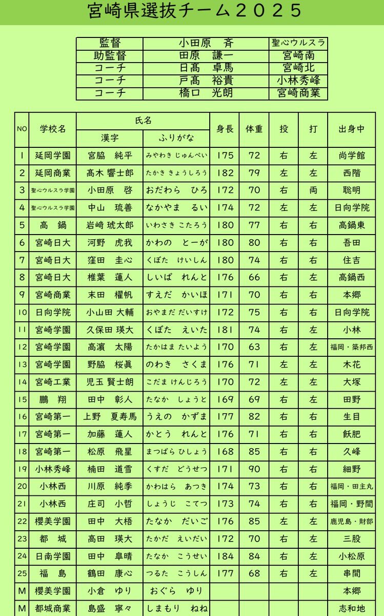 令和7年度選抜チーム交流試合の宮崎県高校選抜選手★中心選手は日南学園の大型二刀流の田中!この世代は宮崎日大の窪田や宮崎学園の久保田、小林秀峰の楠田、櫻美学園の田中、都城の高田ら打てる選手が揃う!#kokoyakyu #miyazaki pic.x.com/q4z62qt1by
