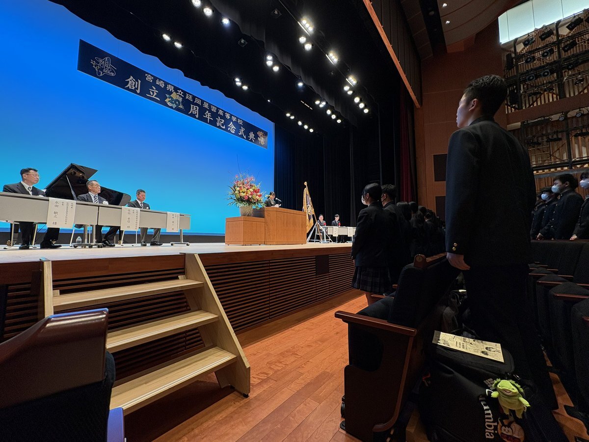 延岡星雲高校 創立20周年記念式典へ!】 "内なる道徳律を示すカントの星輝く延岡西高" "旭日の勢いを示す東雲輝く延岡東高" この2校の伝統をしっかり受け継いで誕生した延岡星雲高校が、創立20周年を迎えました! 今日は、神楽から始まり、校長先生、県教委次長、市長のご挨拶、 pic.x.com/XW0AEViE6c