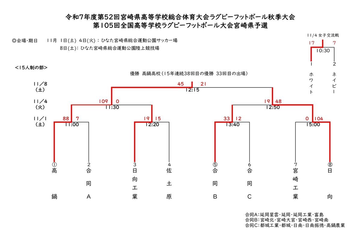 第105回全国高校ラグビー大会宮崎県大会 決勝 11/8  高鍋 45v21 日向 準決勝 11/4  高鍋 109v0 日向工  合同B 19v48 日向 合同A:延岡星雲,延岡,延岡工業,富島 合同B:宮崎北,宮崎大宮,宮崎西,宮崎南 合同C:都城工業,都城,日南,日南振徳,高鍋農業 pic.x.com/4LgEh5Rcqz