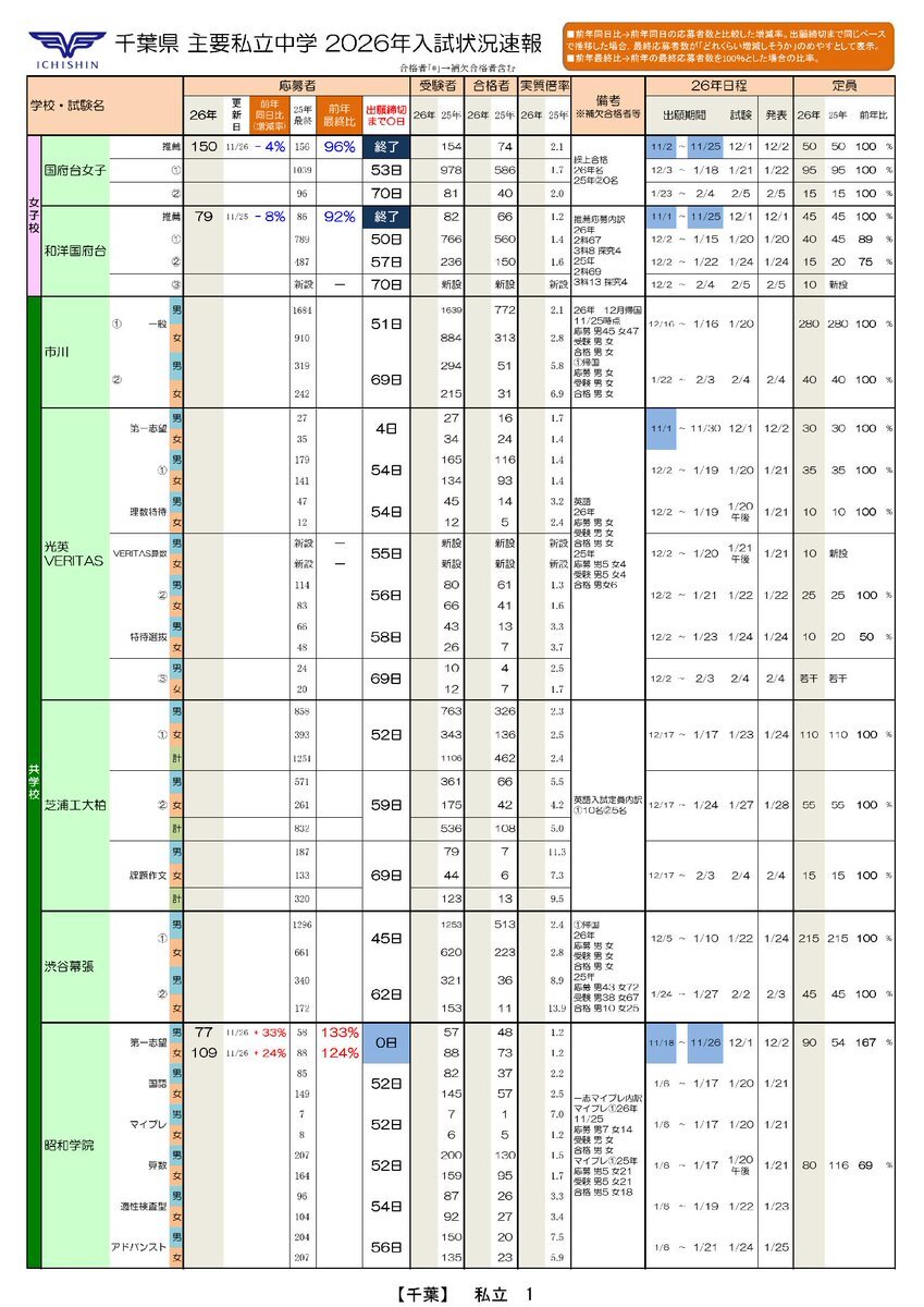 中学受験情報ナビ🆙2026年入試速報🌟 🏫千葉・茨城私立🆕出願状況 ⚡前年同日比 国府台女子-3% 和洋国府台-13% 昭和学院 男+35%女+27% 千葉日大 男-19%女+8% 流経柏 男+19%女-7% 江戸取 適 東 男-4%女+49% 千葉明徳・二松柏・流経柏も✨ 🔽市進中学受験情報ナビで✅ chu-jukennavi.net/sokuhou.html #中学受験 pic.x.com/GroupU0kza