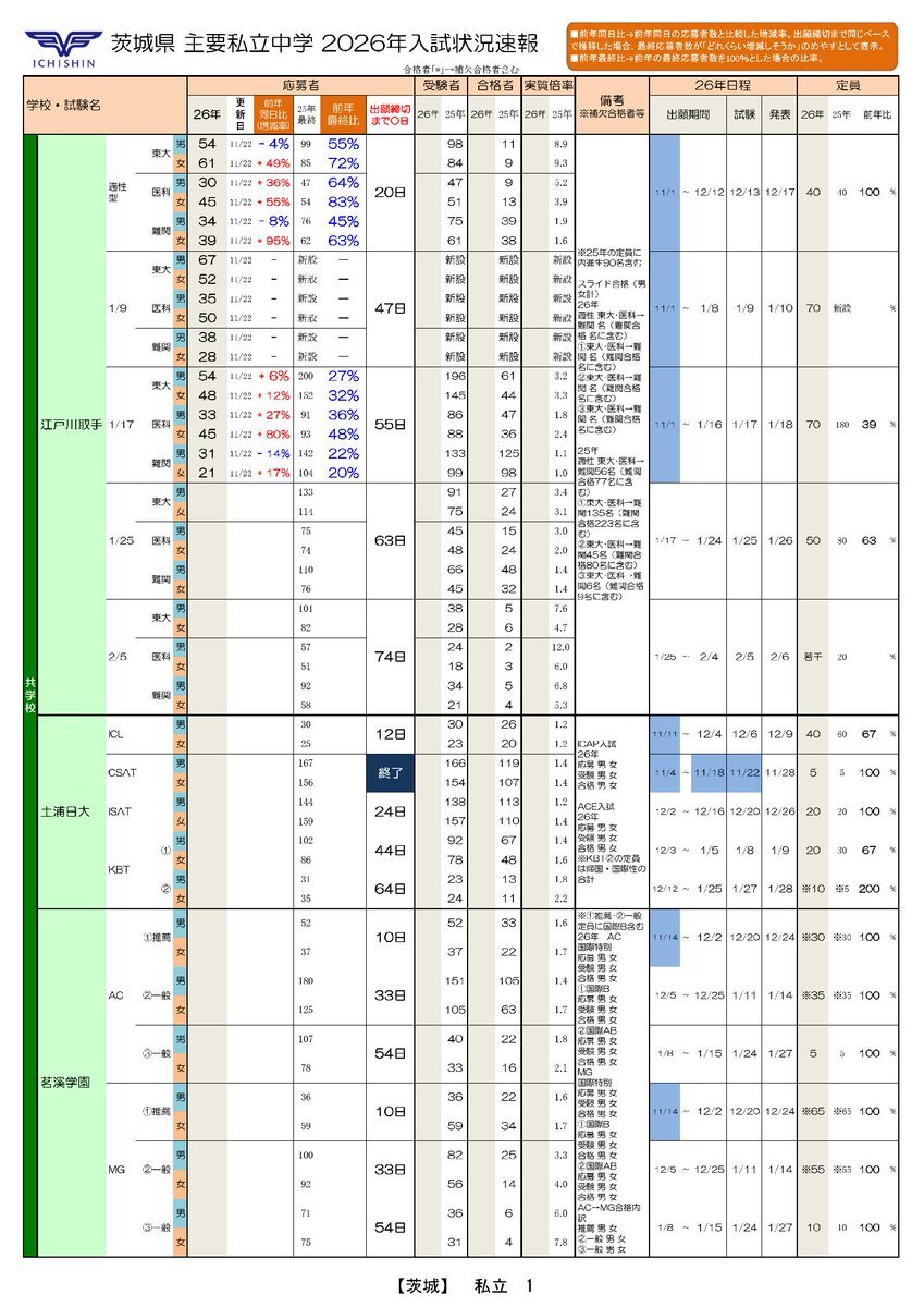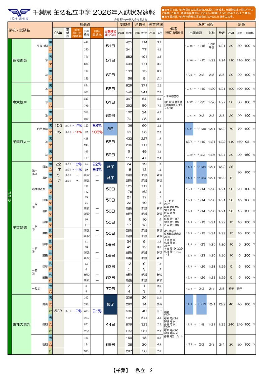 中学受験情報ナビ🆙2026年入試速報🌟 🏫千葉・茨城私立🆕出願状況 ⚡前年同日比 国府台女子-4% 昭和学院 男+33%女+24% 千葉明徳 男-8%女-11%(新設の選抜クラスを除く) 江戸川取手 適 東 男+5%女+33% 医 男+31%女+69% 難 男+23%女+77% 🔽市進中学受験情報ナビで✅ chu-jukennavi.net/sokuhou.html #中学受験 pic.x.com/LLpDWiSXIS