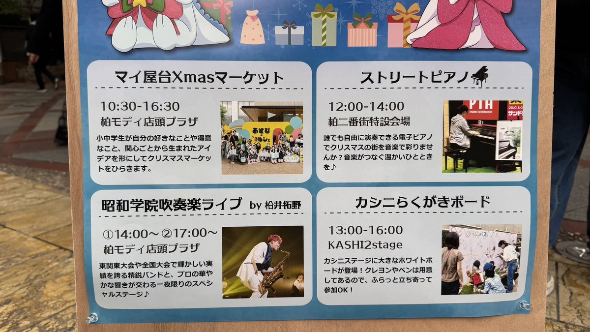 柏二番街では、ストリートピアノ、カシニらくがきボード、マイ屋台Xmasマーケット、昭和学院吹奏楽ライブby松井拓野、と楽しい企画がてんこ盛りです! #カラフルハートクリスマス pic.x.com/Q1hcjaZiDb