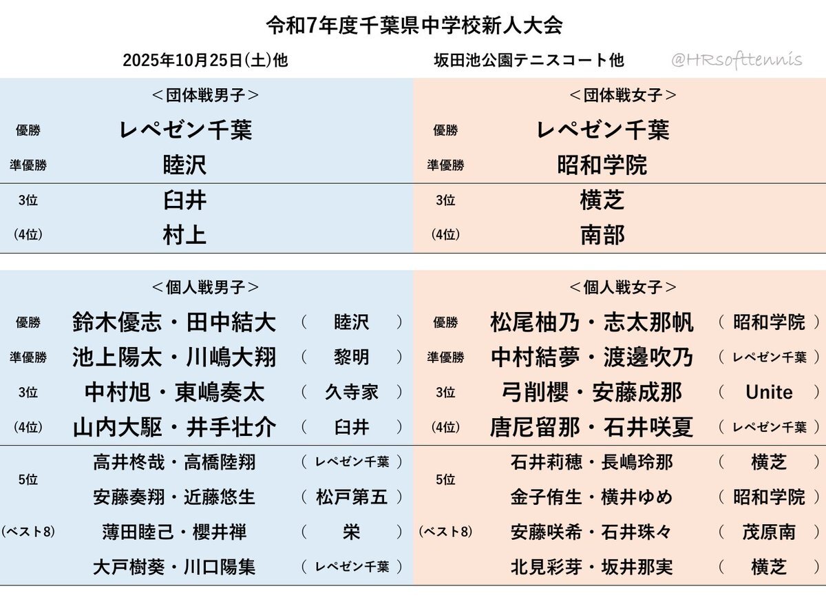 【千葉県中学校新人戦】#ソフトテニス 優勝 団体 男子 レペゼン千葉 女子 レペゼン千葉 個人 男子 鈴木・田中(睦沢) 女子 松尾・志太(昭和学院) 令和7年度千葉県中学校新人大会 2025年10月25日(土)他 坂田池公園テニスコート他 pic.x.com/06w3utBel1