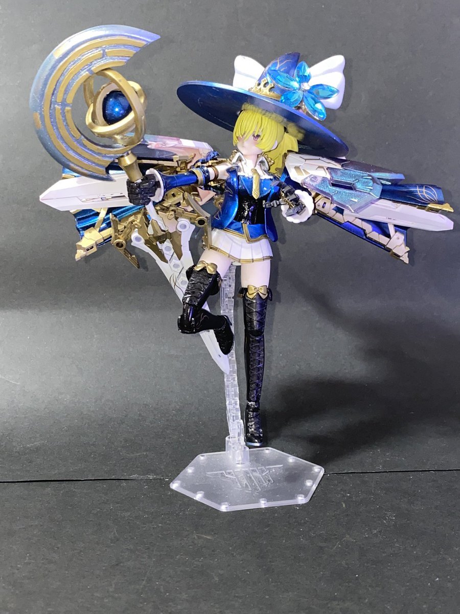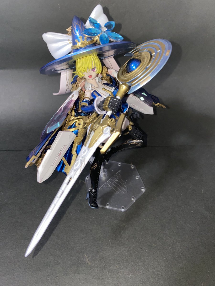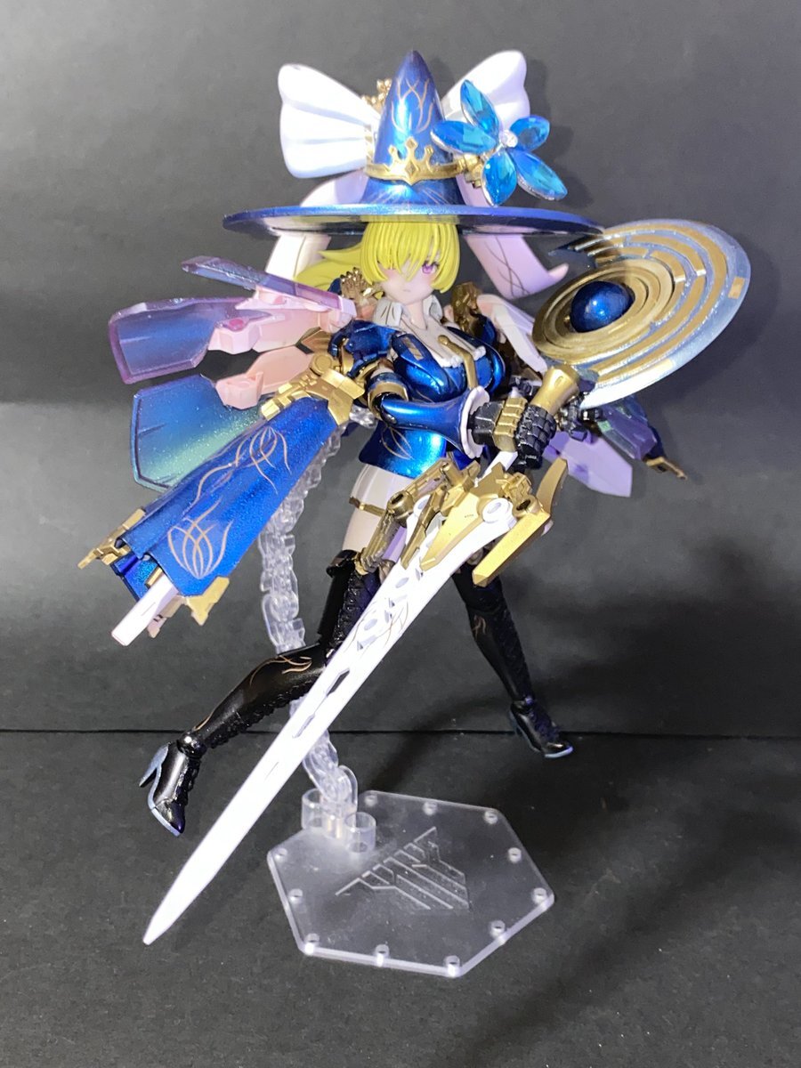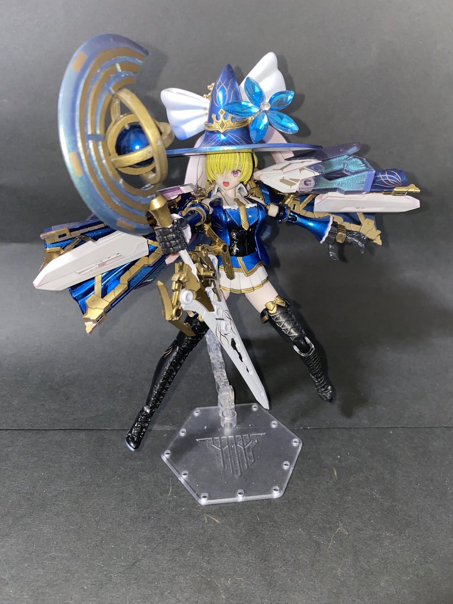魔女の杖っぽく見える武器はバスタードソードを改造した近接武器であり、杖の月形の部分も斧として使えます 中央の天球儀型のユニットを展開することでやビームや斬撃を放つことができるようになります 杖名称【重月杖】 pic.x.com/kJveorZasF