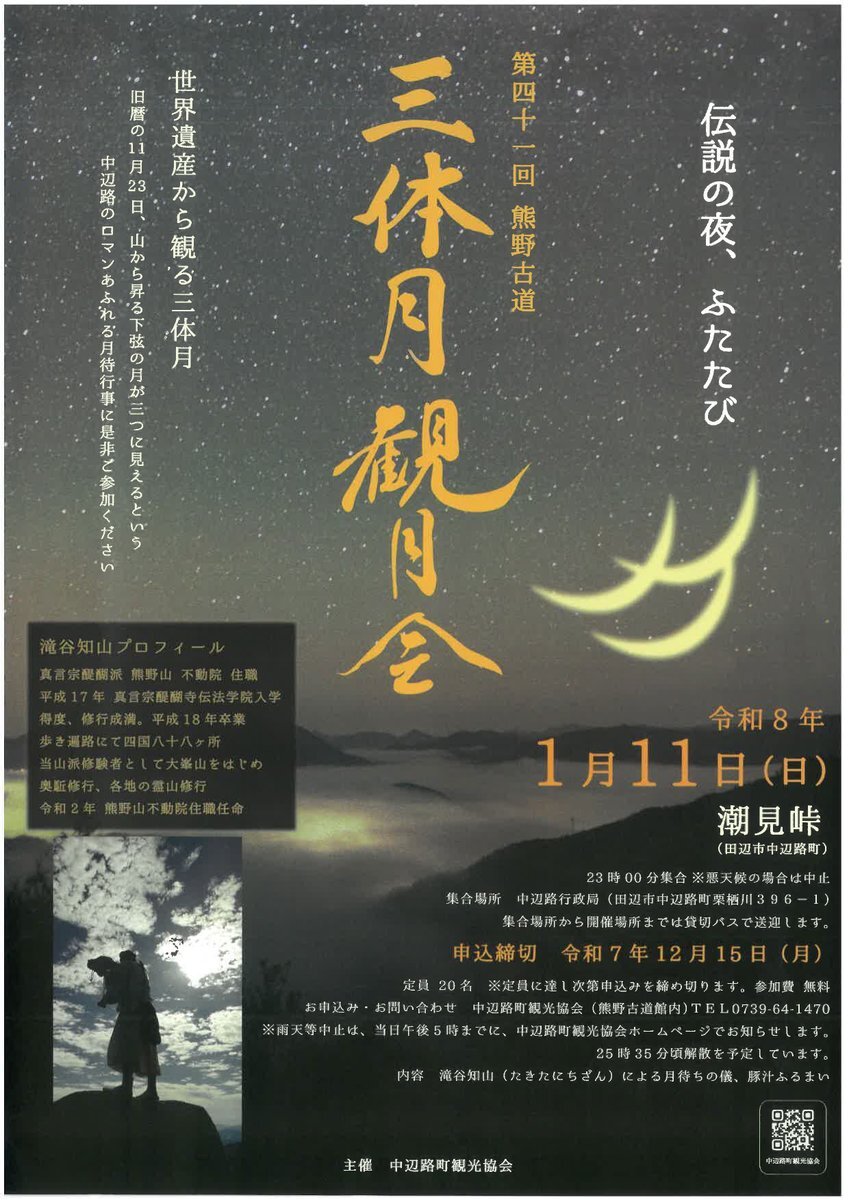 ●伝説の三体月観月会● 1月11日(日)深夜、「熊野古道三体月観月会」を中辺路町潮見峠にて開催します。 今年は、滝谷知山(熊野山不動院住職)による月待ちの儀を行います。 参加申込は熊野古道館(0739-64-1470)まで。 nakahechi.jp
