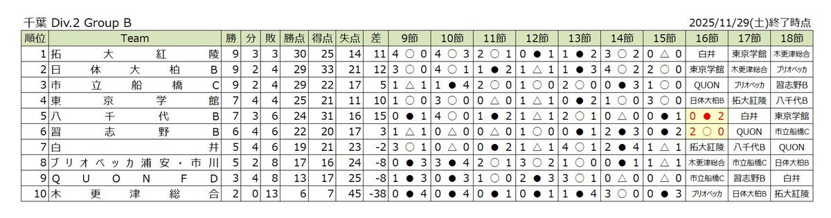 2️⃣種 高円宮杯 JFA U-18   サッカーリーグ2025 千葉 ⚽️ 【 Results 】Div.2B 第16節 11/29開催  習志野B 2-0 八千代B 習志野Bが勝利 ✨ おめでとうございます 🎉 残留に大きな勝点3を獲得 ✌️ 首位は拓大紅陵 👍