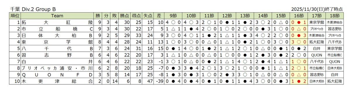 2️⃣種 高円宮杯 JFA U-18   サッカーリーグ2025 千葉 ⚽️ 【 Results 】Div.2B 第16節 11/30開催  東京学館 3-0 日体大柏B  白井 1-0 拓大紅陵  市立船橋C 0-0 QUON  ブリオベッカ 2-1 木更津総合 首位 拓大紅陵、2位 日体大柏Bが敗戦 💦 市立船橋Cが勝点1で2位浮上 ✨ 首位と勝点で並んだ 🔥 pic.x.com/GVvVhsEFIh x.com/pivo00606444/s…