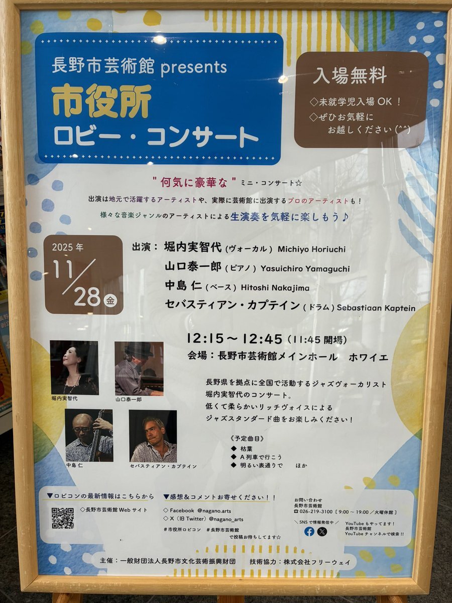 #長野市芸術館 ロビーコンサート Vo #堀内実智代 さん Key #山口泰一郎 さん B #中島仁 さん Ds #ゼバスティアン・カプテイン さん Vo.堀内さんは長野市松代出身、カナダ留学後Jazz活動を始め、現在は上田市在住 "軽井沢ジャズファクトリィ" カルテットで活動中‼️ 知らんかった🧐本格Jazz vocalist‼️ pic.x.com/0aNQINynLY