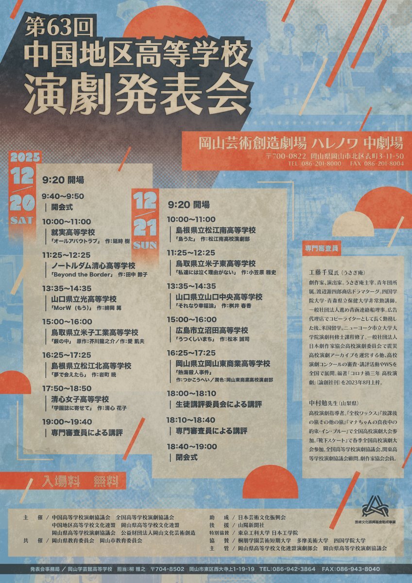 第63回中国地区高等学校演劇発表会 岡山芸術創造劇場ハレノワ 12/20(土)開場9:20~(上演①就実10:00~) 12/21(日)開場9:20~(上演⑦松江南10:00~) 岡山芸術創造劇場ハレノワ(岡山市北区表町3丁目11-50) 入場料:無料 pic.x.com/7Nsz20W37G