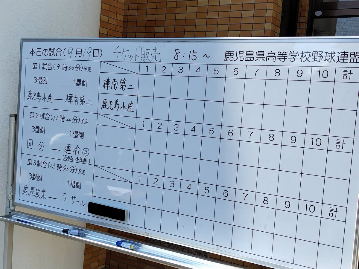 第157回九州地区高等学校野球大会鹿児島県予選、9月19日の試合日程 1回戦3試合 ~市民球場~ ①樟南第二 対 鹿児島水産(9時) ② 連合3 対 国分 ③ラ・サール 対 鹿屋農業 ※連合3:志布志・串良商業