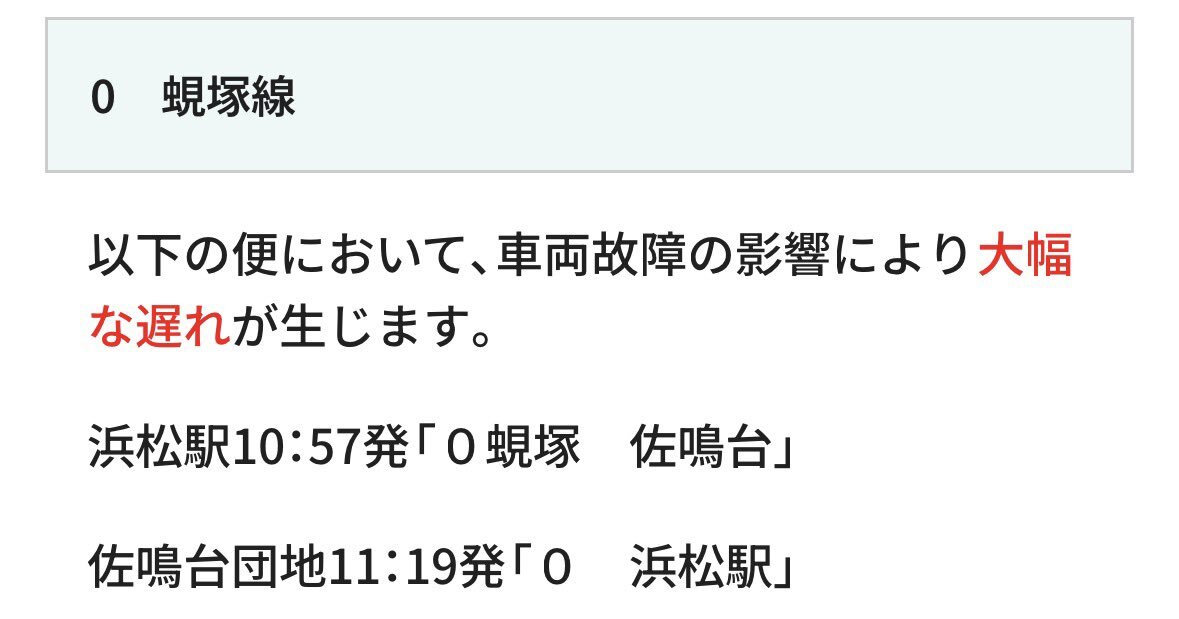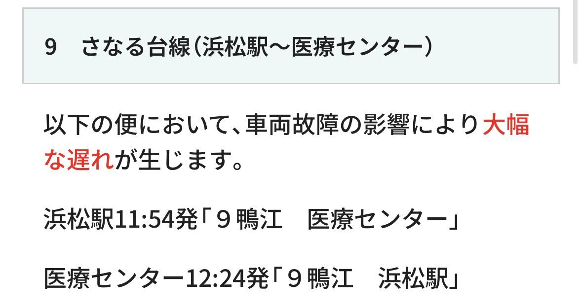 【運行情報】 車両故障により一部路線に遅れが生じております 詳しくは遠鉄バスHPをご確認ください。 bus.entetsu.co.jp/bus-lines バスの走行位置は バスどこ!? をご確認ください。 transfer-cloud.navitime.biz/entetsu?featur… お急ぎのところご迷惑をおかけし申し訳ございません。 #遠州鉄道 #遠鉄バス