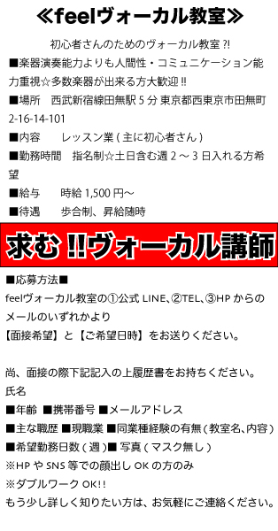 西東京市で歌を始めるならfeelヴォーカル教室。講師の生演奏で歌のレッスンをするので上達がとても早いです。西東京市田無 feelヴォーカル教室は西東京市西武新宿線田無駅より徒歩5分。 f-vocal.jp #ヴォーカル教室 #西東京市 #田無 #保谷 pic.x.com/gZbunvqknw