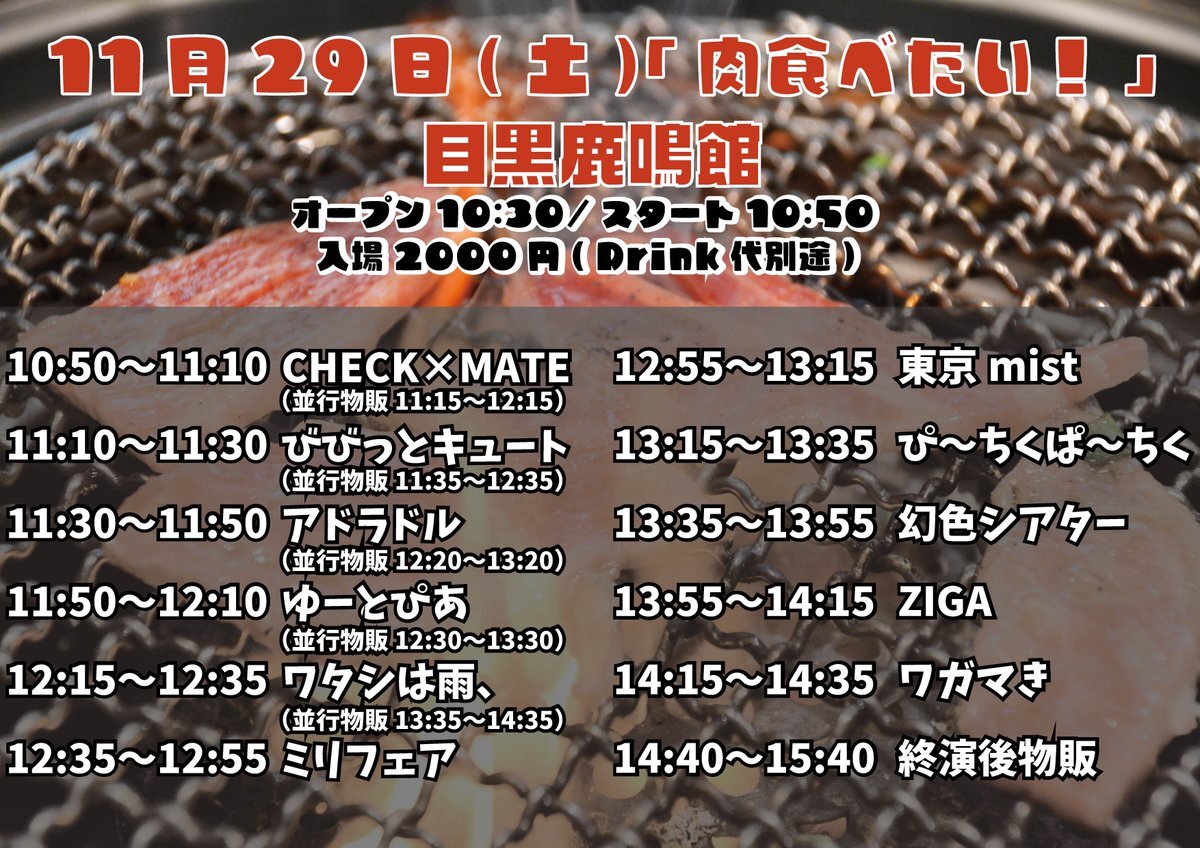 明日のミリフェア✨️ 「肉食べたい!」 📍目黒鹿鳴館 ⏰オープン10:30/スタート10:50 👛入場2000円(Drink代別途) LIVE🎤12:35-12:55 特典会📸14:40-15:40 動員特典💝2s写メ 🎫 t-dv.com/nikutabetai