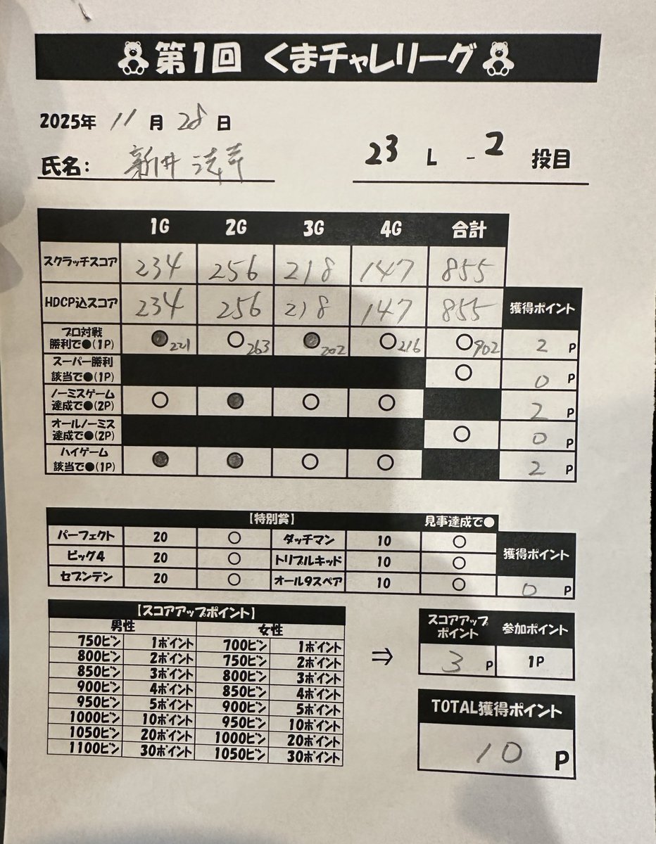 #くまチャレリーグ🧸 第8週🎳 前半23-24L、後半27-28L 今週も三浦美里プロパターン 3G目までは良かったけど、今日までの連勤の疲れが最後に出てドマイナス😥 まあポイントは稼げたけど🤭 熊木プロの始球式(スコア反映せず)からのやり直し(スコア反映)の動画をお楽しみください🤣 pic.x.com/m1k6OMT10Y