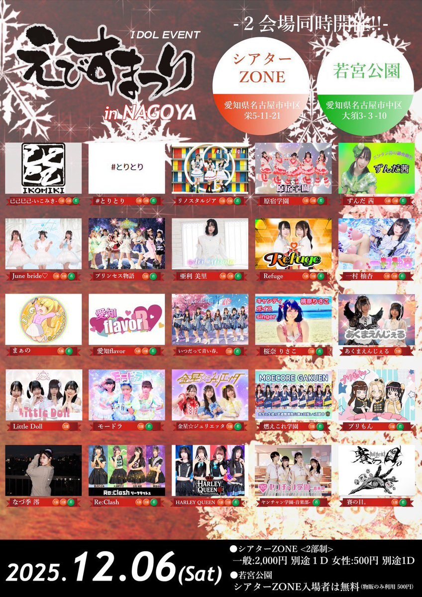 【亜利美里🐥愛知遠征🚄】 12/6(土) アイドルイベント『えびすまつり』inNAGOYA ebisumaturi-idoldrunker.com 📍シアターZONE : 一般2000円/女性500円 1D代別 🐥1部、2部出演! 📍若宮公園 : シアターZONE入場者は無料(物販のみは500円) 🎟️予約は不要です! 3公演となります! お茶会も予定してます☕️ pic.x.com/sjnaLvGXVE