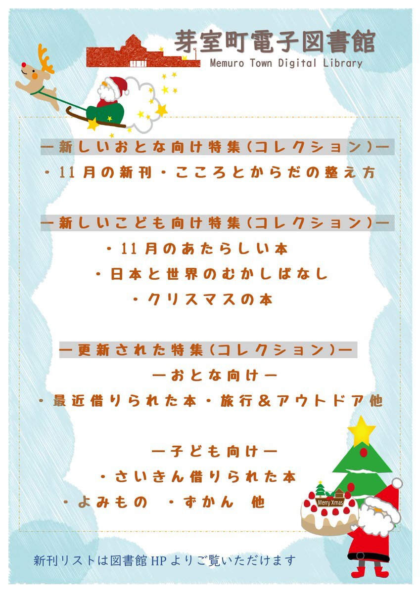 【🎅電子図書館のお知らせ📢】 電子図書館に新しい特集(コレクション)が 加わりました(^^♪ クリスマスの本の特集もありますので、 ぜひ覗いてみて下さいね!お待ちしています🎁 memurotown.overdrive.com #電子図書館 #芽室 pic.x.com/C1QOoCCPeD