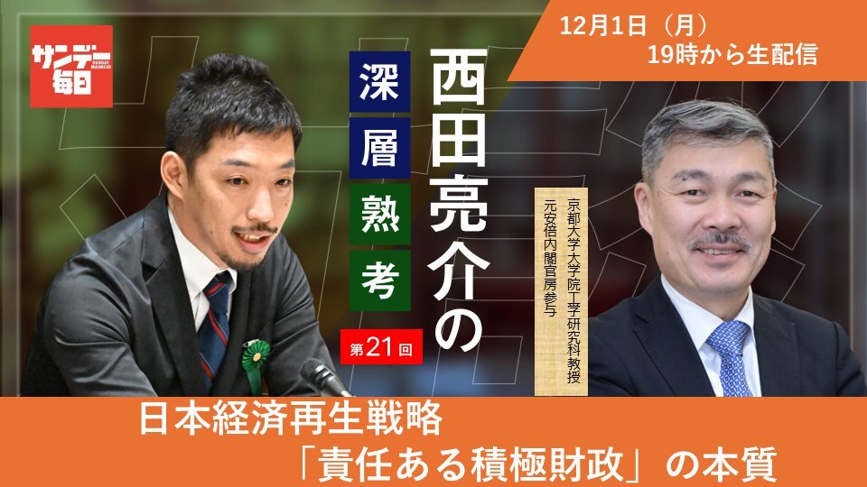 📢 12月1日(月)19:00〜ライブ配信! 【西田亮介の深層熟考】第21回 日本経済再生戦略 「責任ある積極財政」の本質 ゲスト:藤井聡(京都大学大学院教授) 🗣 2026年の日本経済の行方を問う90分。 📺 サンデー毎日デジタル(全編) nicochannel.jp/sundaymainichi… 📺 YouTube(前半無料)