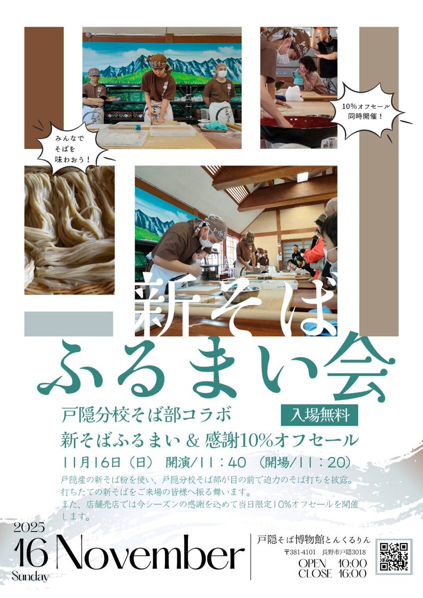 【吉田分校そば部「新そばふるまい会」開催!】 11月16日(日)、戸隠そば博物館とんくるりんにて「新そばふるまい会」を開催いたします。 長野吉田高校分校そば部のみなさんが、1㎏の大きなそば打ちを披露。戸隠産新そばを使用した薫り高いおそばをぜひご賞味ください♪#戸隠 #戸隠そば ym pic.x.com/PGc7Et8BcM