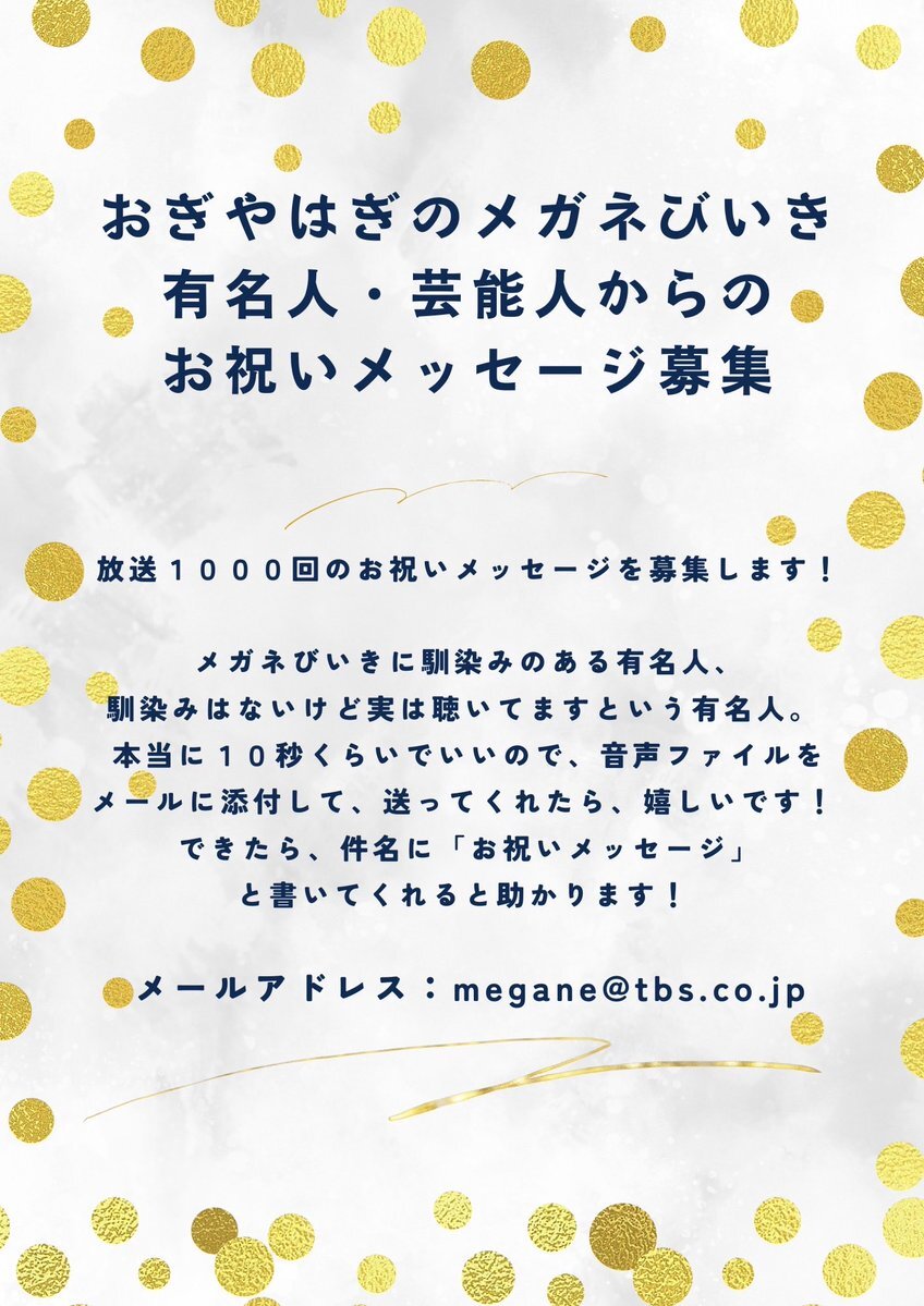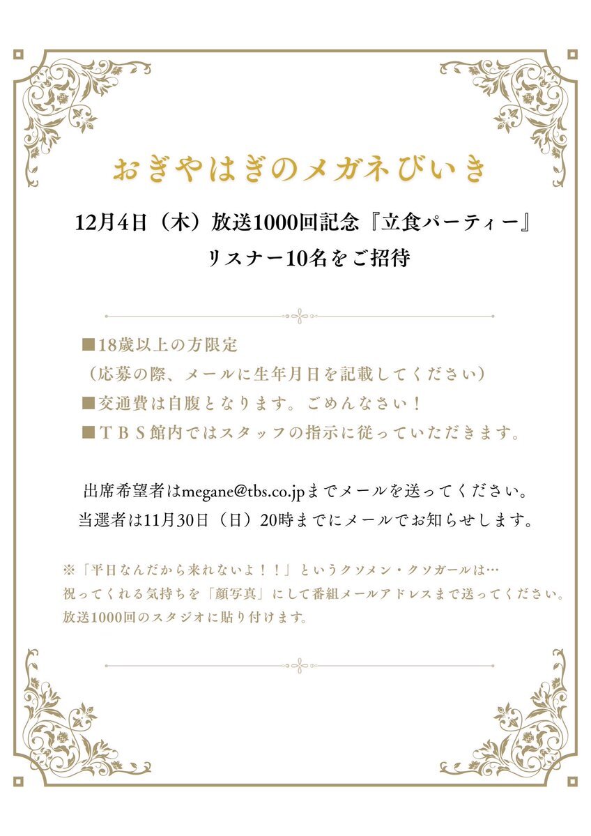 【おぎやはぎのメガネびいき】 12/4(木)放送1000回記念 『立食パーティー』!! ★列席者として…リスナーをスタジオに 招待!(10名) ★有名人・芸能人からの放送1000回のお祝いメッセージを大募集! 立食パーティー応募・お祝いメッセージは…megane@tbs.co.jpまで! #meganebiiki pic.x.com/ze3vnLWfdW