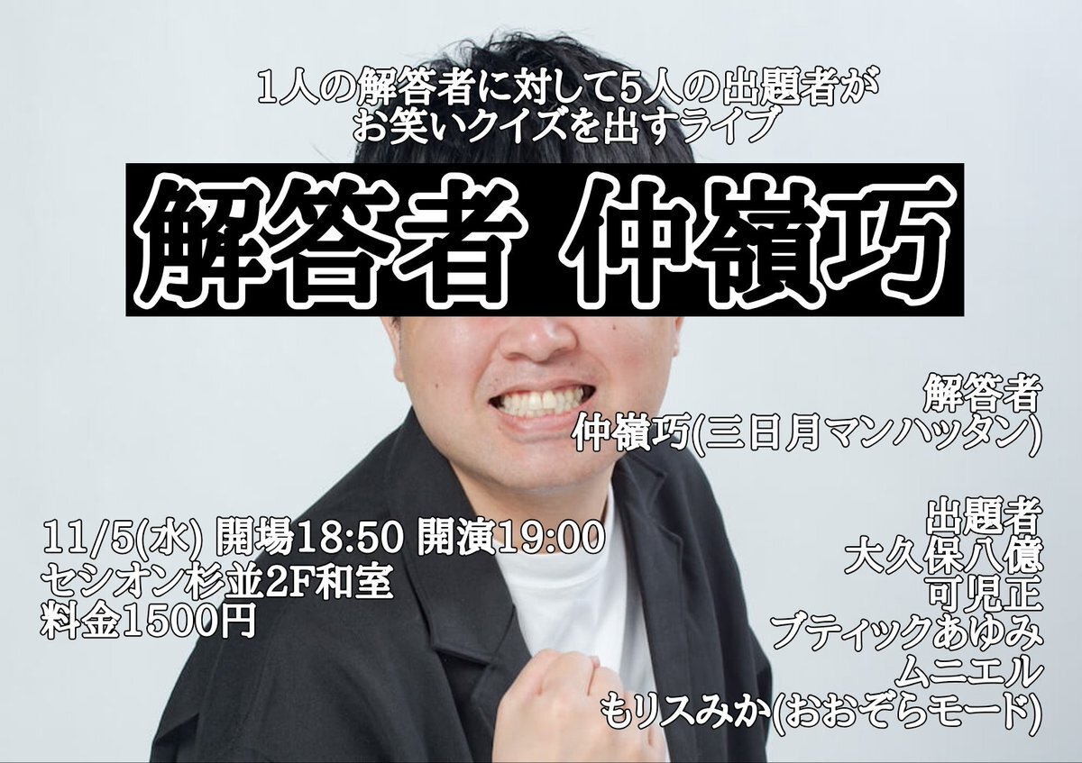 【解答者 仲嶺巧】 11/5(水) 開場18:50 開演19:00 セシオン杉並2F和室 料金1500円 予約tiget.net/events/432873 【解答者】 仲嶺巧(三日月マンハッタン) 【出題者】 大久保八億 可児正 ブティックあゆみ ムニエル もリスみか(おおぞらモード)