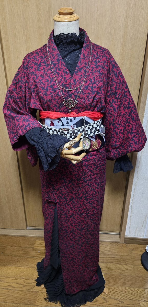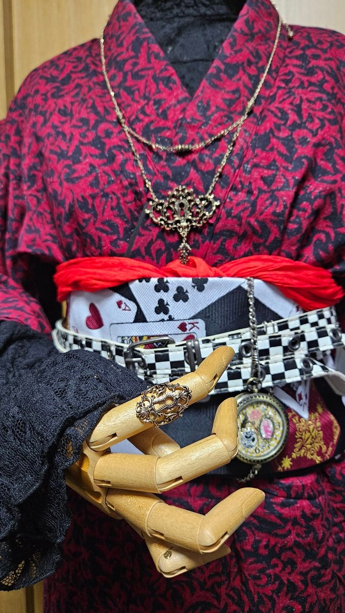 本日の #神木コーデ はハートの国! とあるコラボカフェに行ってきた😚💕 フリル付き着物、伊達襟ナシレース袖。トランプ柄の帯! 小物アクセはクラシカルロリィタのくる実さんの #しまむらコラボ の鍵と鍵穴のペンダント&指輪✨懐中時計はアリスワンダーランド柄 足下はMAYLAさんの靴🥰 #着物コーデ pic.x.com/mrHahOR8Kp