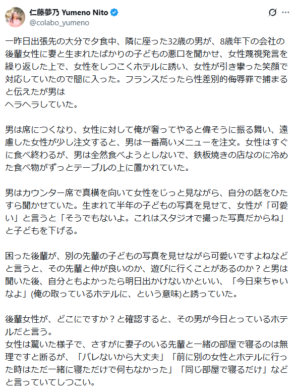 仁藤さんが出張先で隣の会話をずっと盗み聞きしてる投稿をしていたのですが… となりの会話よりも、仁藤夢乃さんに夫がいたことに一番驚いた🐶