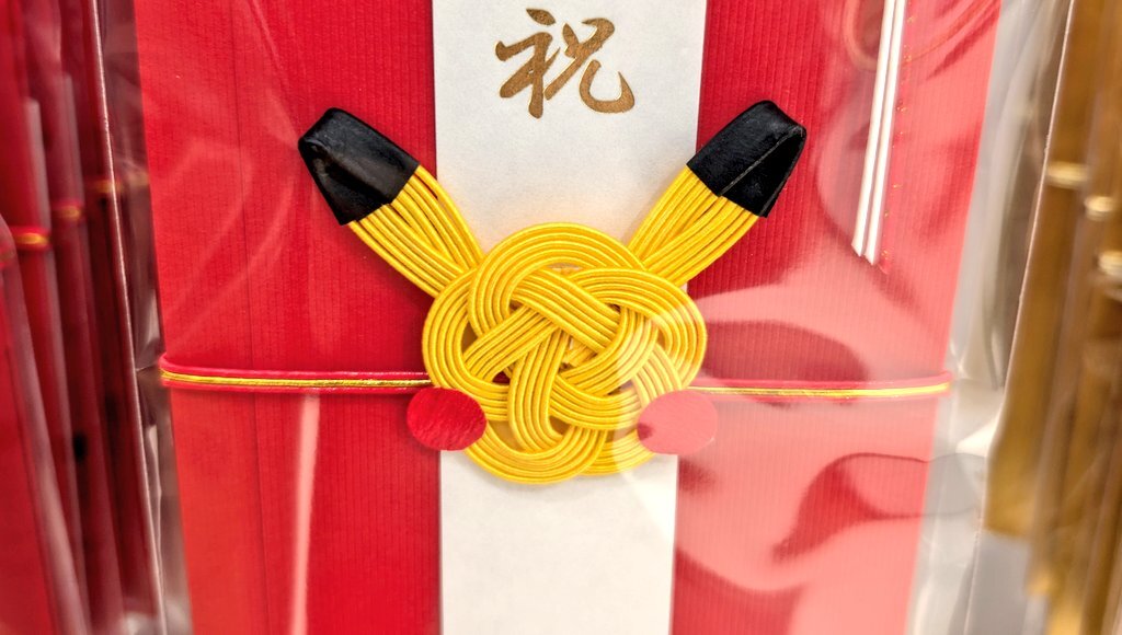 今日友達とポケモンセンターに寄っていてこんなものを見つけてしまった。ご祝儀袋の水引細工がスゲー可愛い&祝儀袋にポケモンと言う発想、キャラの持つ商品展開の幅広さとその柔軟な適応力に目を見張ってしまった👀細工もとても綺麗。細工は日本、組立はベトナムみたい。 pic.x.com/eev8ppbiNj