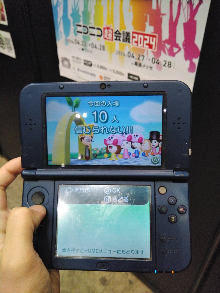 1日目のニコニコ超会議2024、お疲れ様でした!!3DSのすれちがい通信の結果はなんと、25人以上でした!実況者の #Pさん とも実際に出会えてお話ができて嬉しかったです😊 #ニコニコ超会議 #ニコニコ超会議2024 #すれちがいMii広場 #すれちがい通信 #超すれちがい通信 pic.x.com/ZKJnx3lOFm
