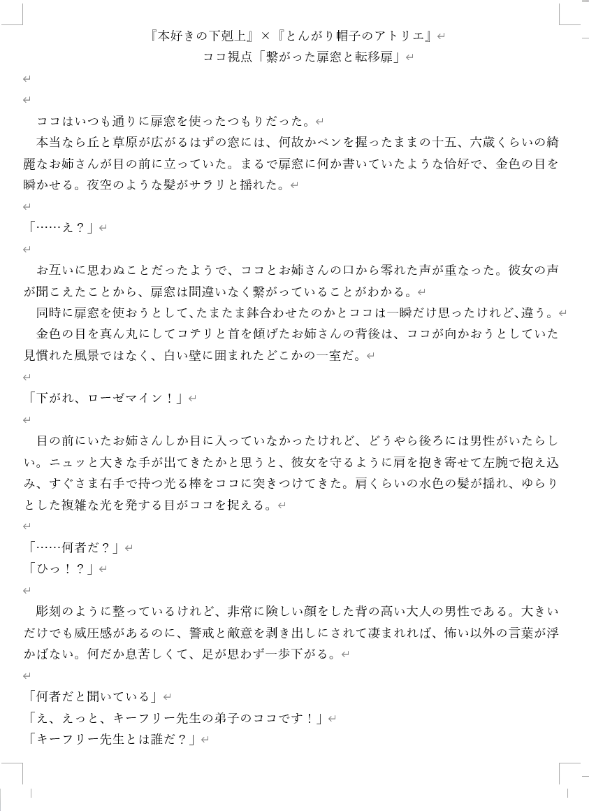 『本好きの下剋上』×『とんがり帽子のアトリエ』 ココ視点「繋がった扉窓と転移扉」 ※白浜先生に許可を得ています。 「なろう」は二次創作ダメなので、画像にしてこちらにあげます。 〆切が終わったら、このSSの挿絵を描いてくれるって。 いやっふぅ! 楽しみ~♪ 画像は5枚です。 →続く