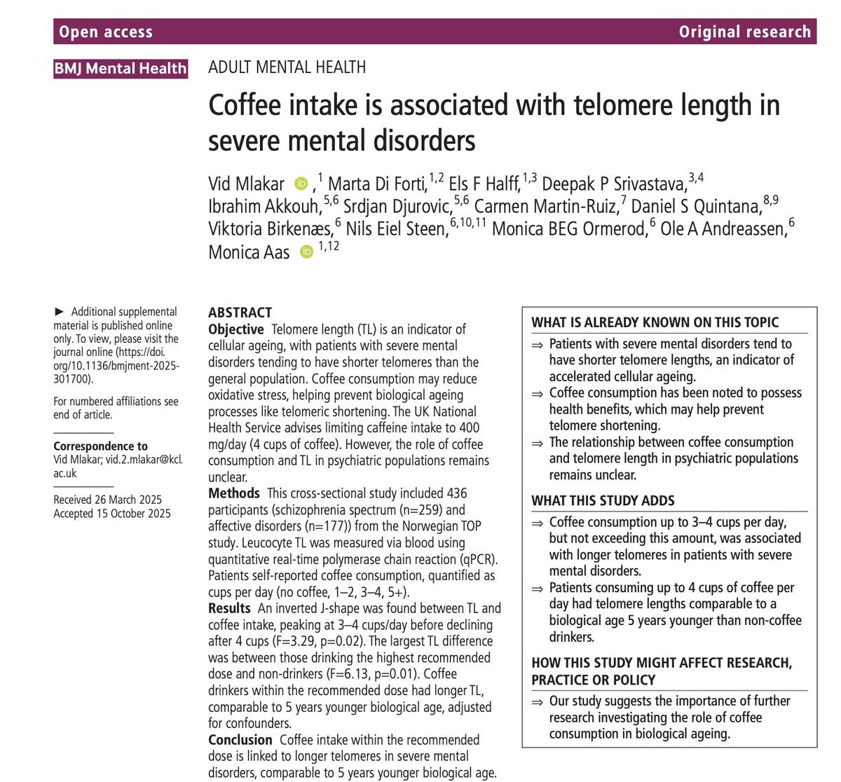 コーヒーと老化の関係 重い精神疾患のある患者436人を調べた研究: コーヒー摂取量とテロメア長(細胞の老化指標)に「逆J字型」の関係 ・最も長いテロメア=3〜4杯/日 。5杯以上ではむしろ低下 ・3〜4杯飲む人は、飲まない人より「生物学的に約5歳若い」