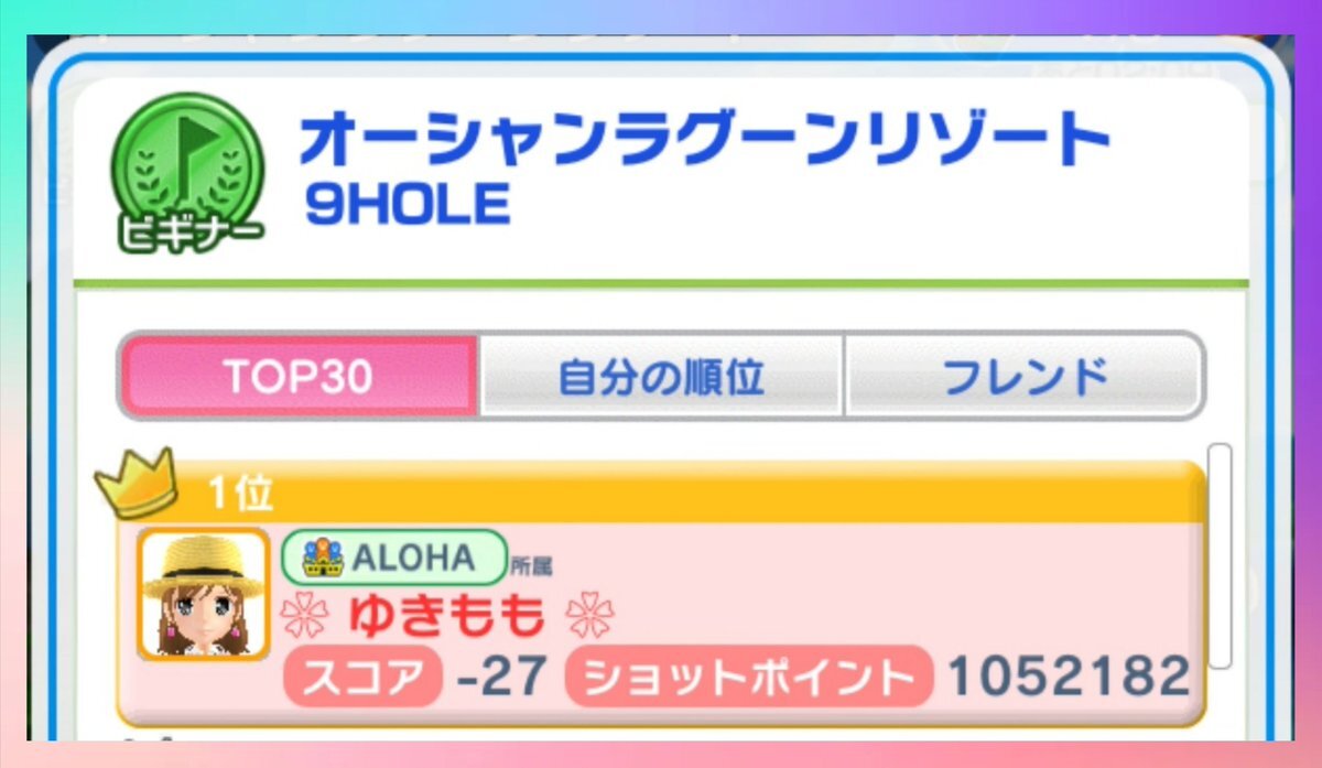オーシャン B3🏖 ばいーんの練習してたら入りました🥰 トナはまだ入ってないのに💦 で、今だけ1位に🏆 横持ちだとピン位置が分かりにくいので、ちょっと調べてみたら全部で8ヶ所あるみたい 今週のトナはADH ひとゴルのビギナーはCDE なのでひとゴルで練習するならDで入らないとなんだよね~💦 pic.x.com/Obc8SBCLIw