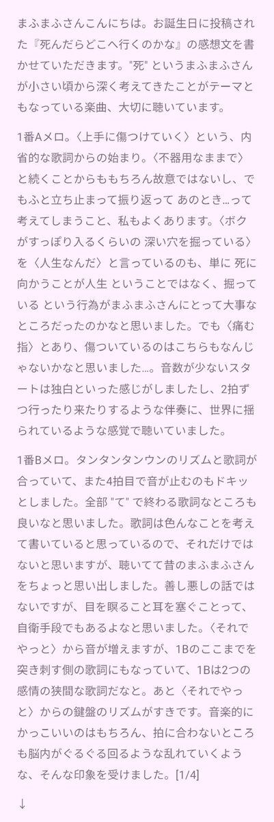 >@uni_mafumafu >#ゆーませみころん まふまふさんこんにちは!『死んだらどこへ行くのかな』の感想文を書いたので、読んでいただけたら嬉しいです!歌詞解説配信もあったので、それも踏まえ歌詞関係の内容を昨日増やしました! まふまふさんとまふまふさんの音楽がだいすき。大切に聴きます( ᵕᴗᵕ )