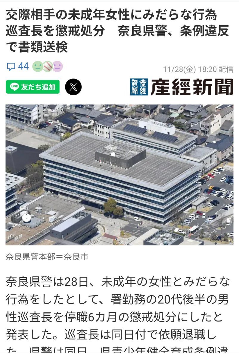 信じられないニュースが入ってきました!奈良県警の巡査長が未成年女性にみだらな行為を行ったとして懲戒処分になったそうです!法律は守らなければならないですね。これからの展開に注目です👀✨ news.yahoo.co.jp/articles/a6e28…
