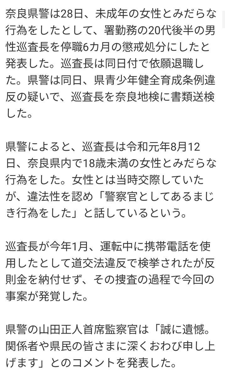 18歳未満とみだらな行為 20代男性巡査長 停職6カ月の懲戒処分(奈良テレビ放送) #Yahooニュース news.yahoo.co.jp/articles/c42b4…