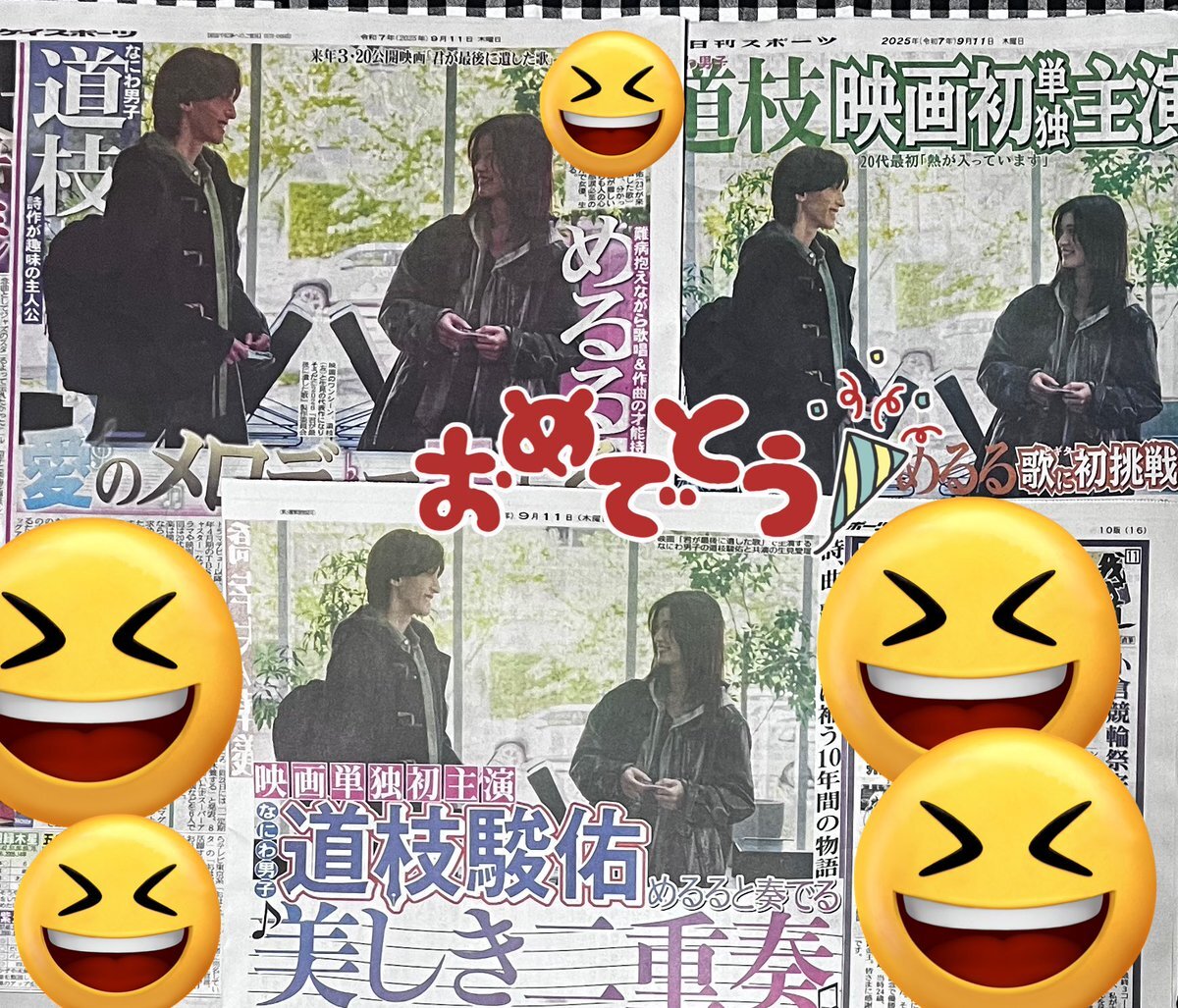みっちー映画初主演おめでとうございます🎊お祝いの新聞買ってきました🩷 透明感半端ない道枝駿佑くん🩷大勢のお客さんが観に来てくださいますように🙏💕 #君が最後に遺した歌 #道枝駿佑 pic.x.com/jMBhISp7qA