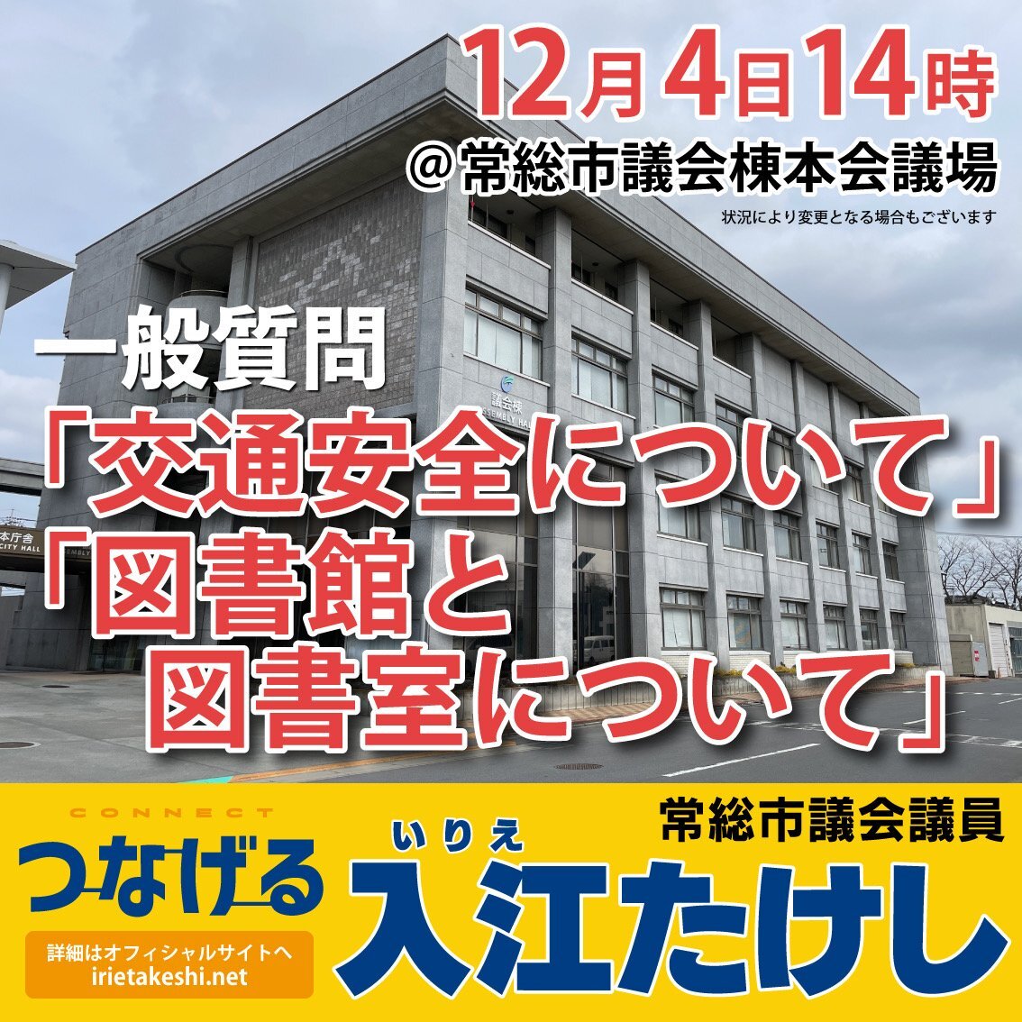 12月議会、一般質問のお知らせです。議会の進み方によりますが、12月4日14時予定となります。 項目は「交通安全について」「図書館と図書室について」です。 交通安全については、具体的に市民の方からいただいた交差点の安全確保について質疑します。(続