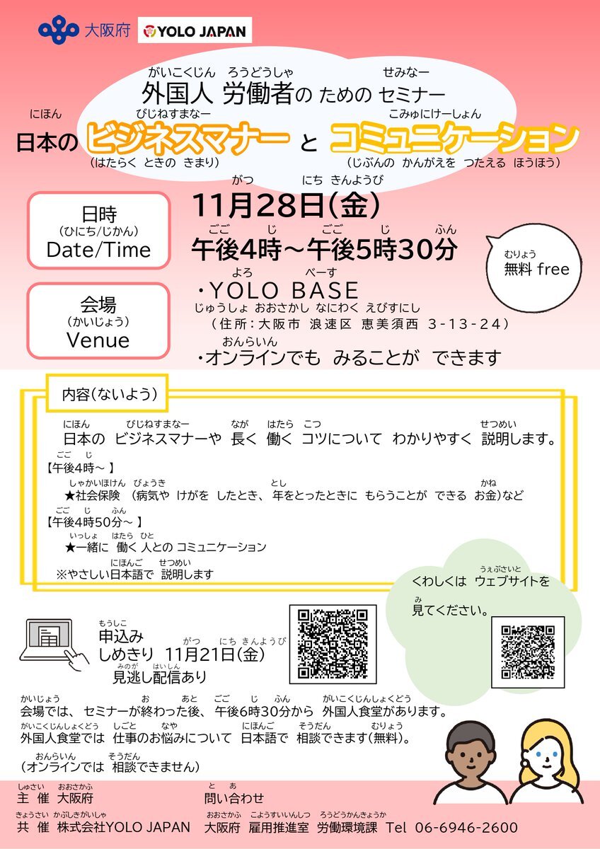 大阪府では、11月28日(金)外国人労働者のためのセミナー「日本のビジネスマナーとコミュニケーション」を実施します。ミニ相談会もあります。詳しくはチラシをご覧ください。 #外国人労働者 #セミナー #ミニ相談会 #ビジネスマナー #コミュニケーション