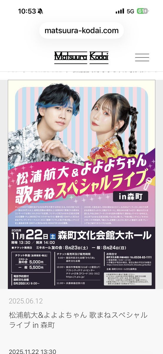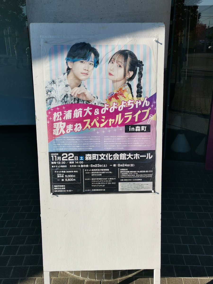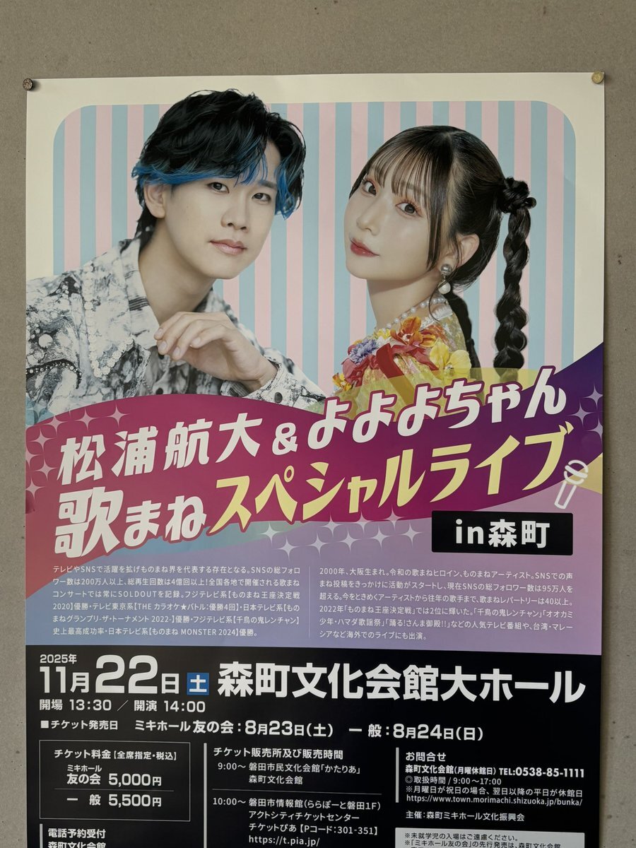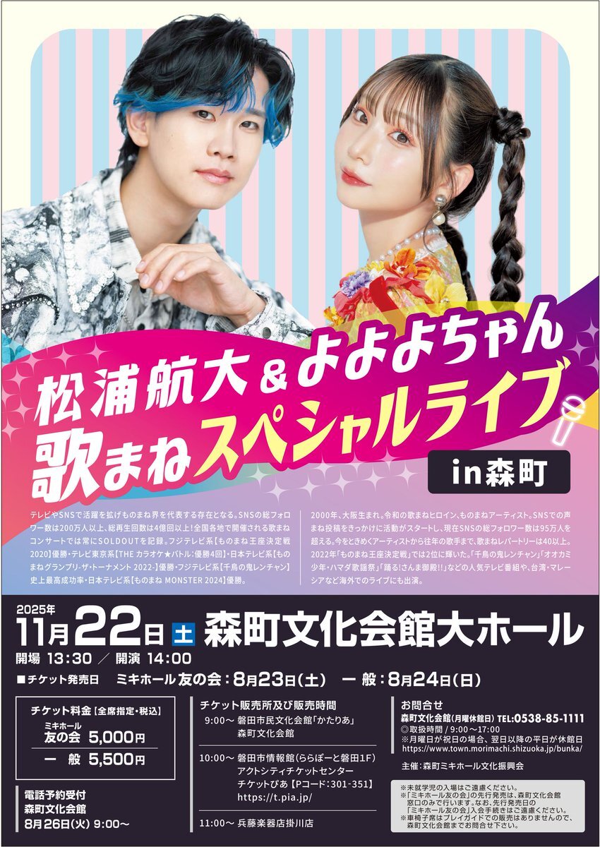【公演情報】✨ 2025/11/22(土) 『#松浦航大 & #よよよちゃん 歌まねスペシャルライブ in 森町』 13:30開場 14:00開演 会場:森町文化会館 大ホール 🎫先行チケットは8月23日(土)~発売開始‼ 詳しくはこちら👇 matsuura-kodai.com/schedule/25723