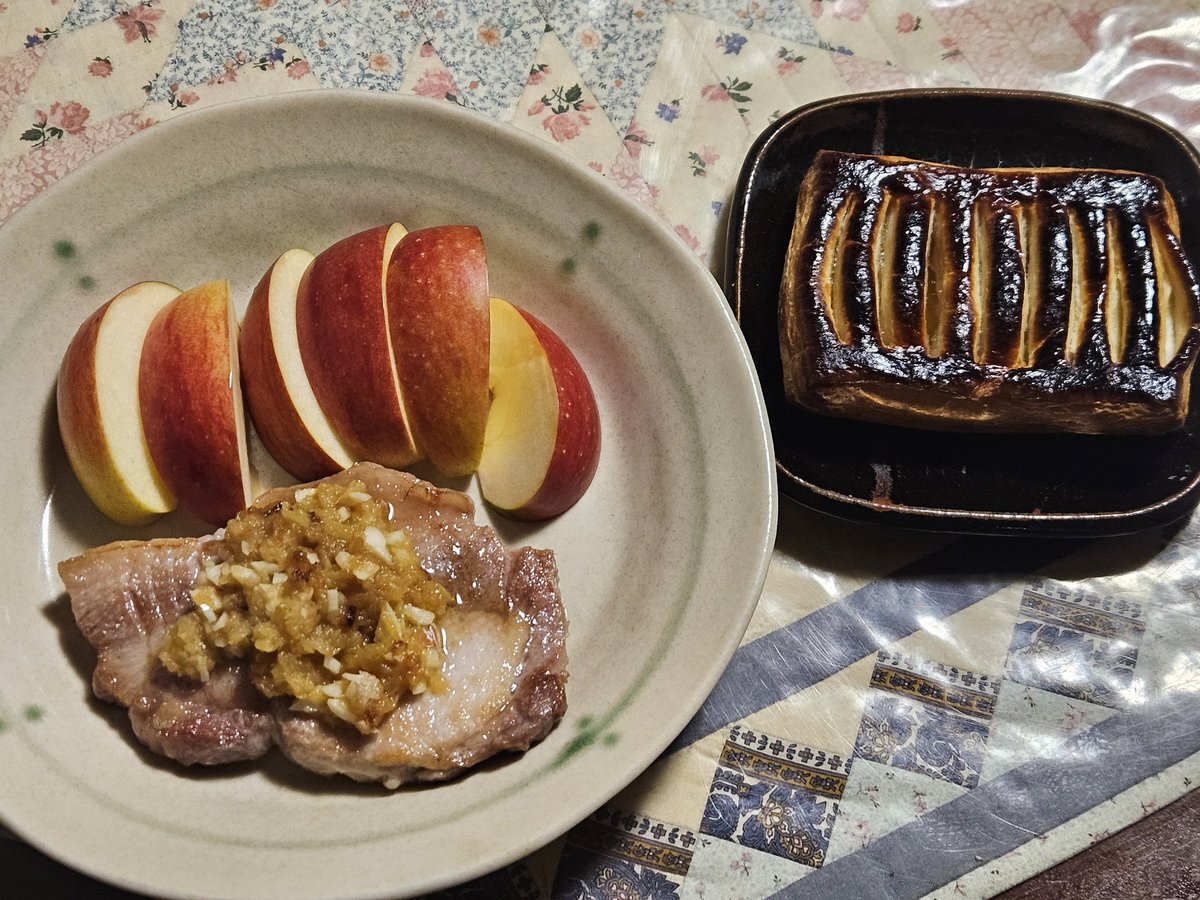 豚肉のりんごとにんにくソース、カットりんごの付け合わせ、焦がしてしまった市販のアップルパイ。 11月5日はいいりんごの日だったそうです🍎💡 #いいりんごの日 #ハピモニ pic.x.com/fPwS6MhXlv