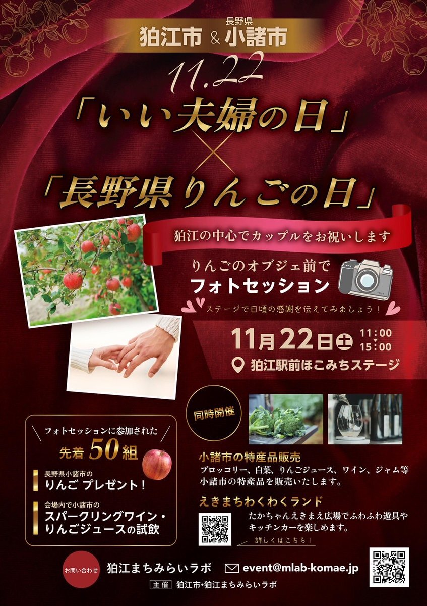 いい夫婦の日×長野県りんごの日 11/22は2つの記念日をWでお祝い🎉 2つの記念日を掛け合わせ、長野県小諸市とのコラボイベントを開催! 日時: 11月22日(土)11時〜15時 場所: #ほこみちステージ 前代未聞のコラボイベント、ぜひ遊びに来てください note.com/mlab_komae/n/n… #いい夫婦の日 #狛江 #小諸 pic.x.com/5FQY2a9XR7