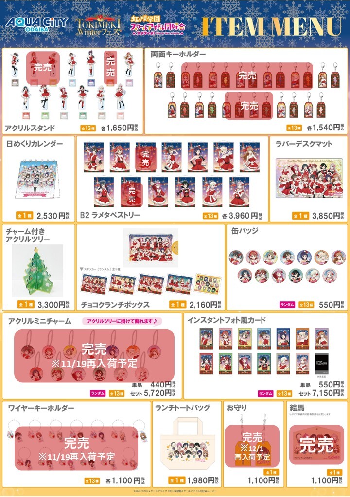 🔔「アクアシティお台場×ラブライブ!虹ヶ咲学園スクールアイドル同好会 TOKIMEKI Winterフェス」🎄 11/17(月)現在の完売状況は画像をご確認ください。 税込3,000円毎にオリジナルグッズが当たる抽選会にご参加いただけます✨ イベント詳細はこちら🎅✨⇒the-chara.com/blog/?p=101248 pic.x.com/BYWkxF5z25