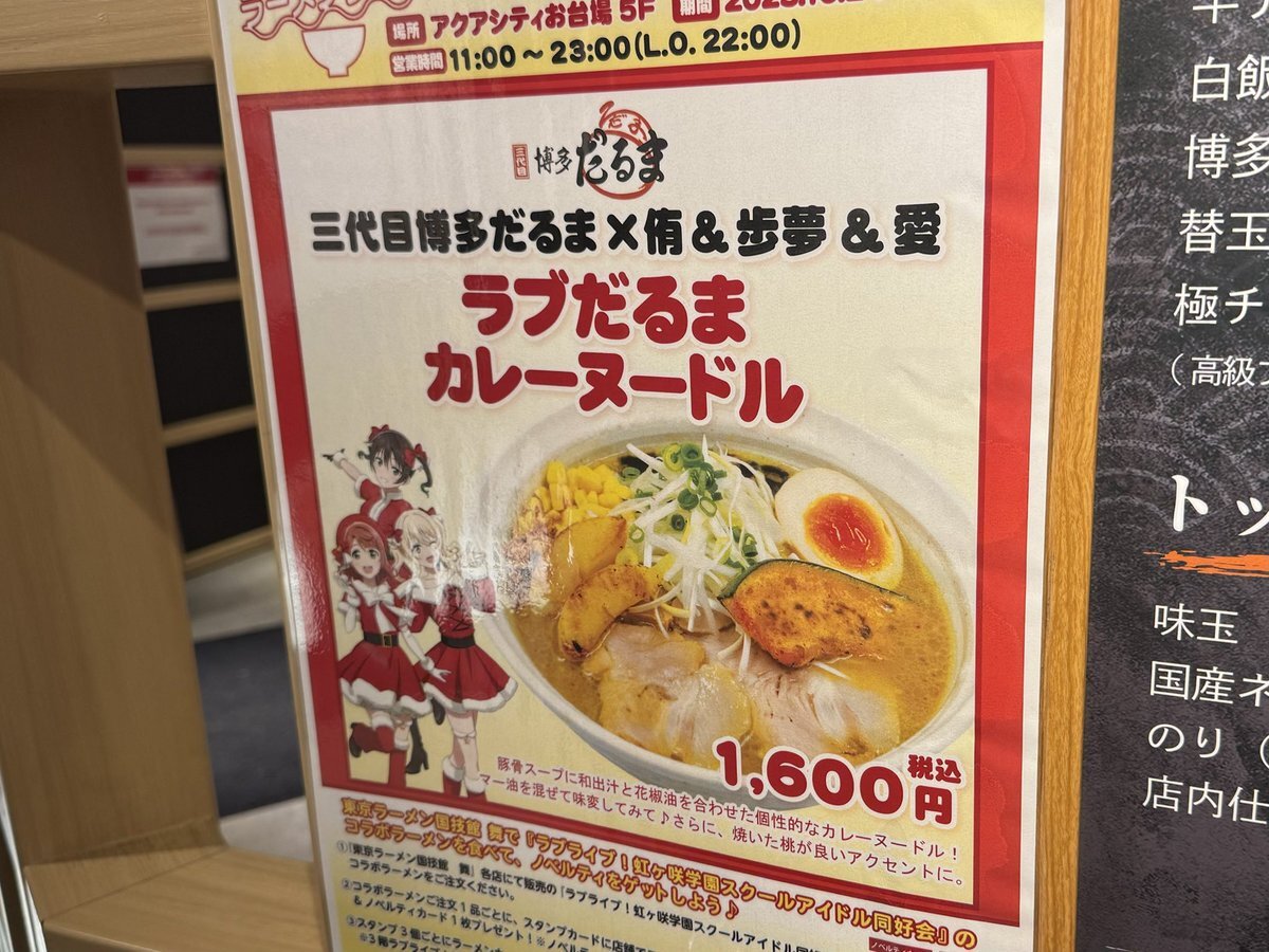 三代目 博多 だるま@アクアシティお台場店 ラブだるま カレーヌードル コラボ限定 ライトな豚骨スープに カレースパイスと花椒油 マー油も加えた 盛りだくさんな仕上がり これだけ入るとケンカしそうだが 絶妙なバランスでまとめられている レギュラー入りしてもいい クオリティの高さ!旨い! pic.x.com/JJ8QoGQ4p8