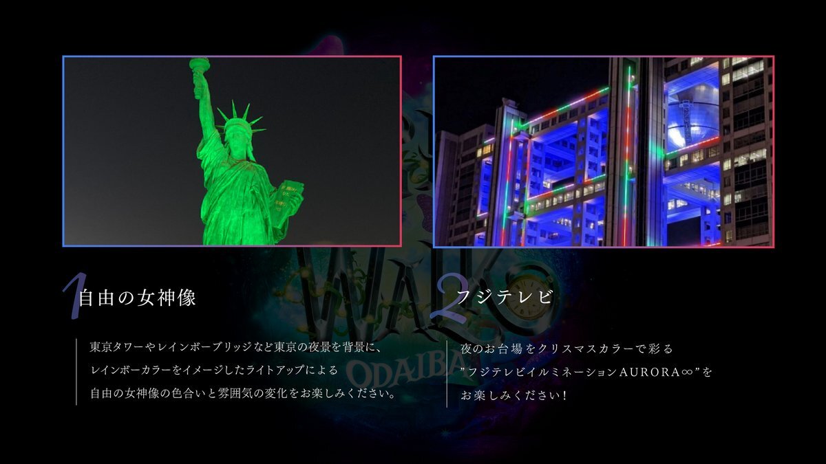 1.自由の女神像🗽​ tptc.co.jp/park/01_02 ​ ​ 2.フジテレビ🏙️​ fujitv.co.jp/aurora/ ​ ​ 3.アクアシティお台場🌕​ aquacity.jp ​ ​ 4.デックス東京ビーチ💙​ odaiba-decks.com/yakei/ ​ 5.ダイバーシティ東京 プラザ🎄 ​ mitsui-shopping-park.com/divercity-toky… ​ ​ 6.ヒルトン東京お台場🏨 pic.x.com/phj14TfC7T
