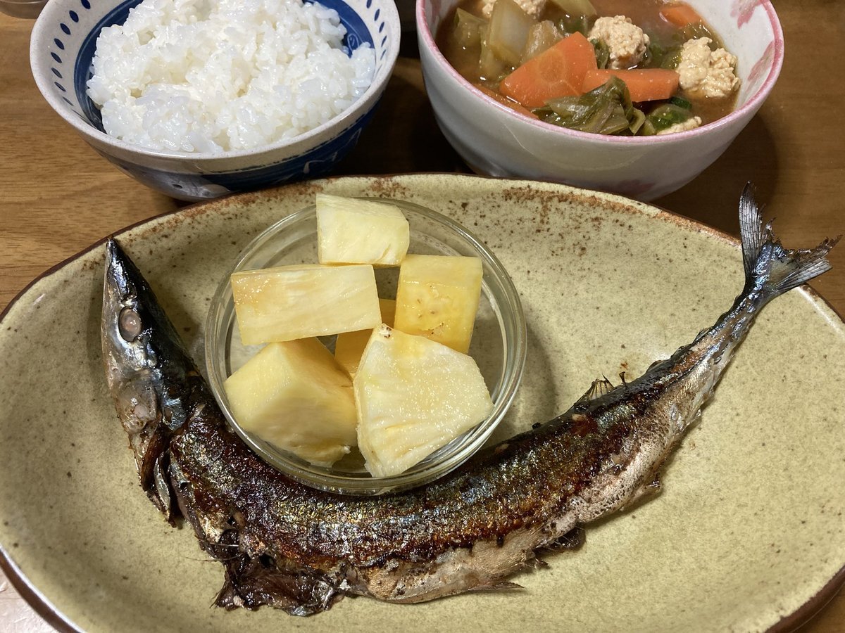 🔴🐟さんま 🔴🟢鶏団子の味噌汁 🟡息子には米あります 🟢パイナップル さんま、一時期よりもすこーし高くなってる気がする?…と思ったら、解凍じゃなくて生だった。なるほど。 一度凍らせたものでないならアニサキス対策でよーく焼かねば…と思ったら焦がし気味になっちゃった😂 pic.x.com/LTJ4ucAuVg