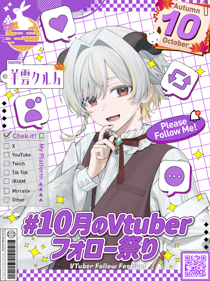 ◤ #10月のVTuberフォロー祭り ◢ 羊の執事Vtuber羊雲クルムです🐏 年内登録者数3000人目指しています☕ ✨良すぎる見た目 ✨見た目にあった落ち着いた優しい声 ✨高頻度配信 今月も沢山の人に見つけてもらえますように🫶 💜♻💬全て巡回します #Vリスナーに見つかりたい