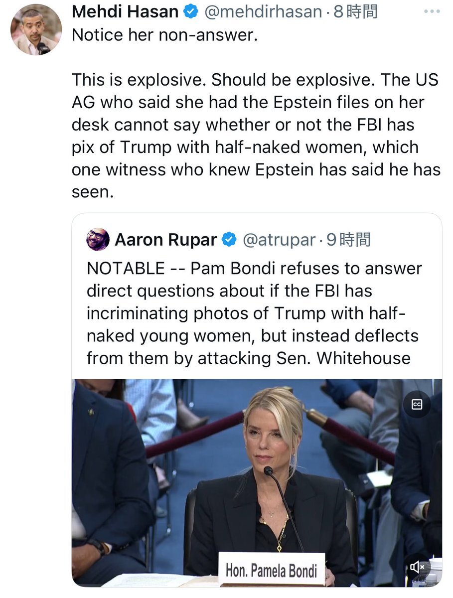 訳: 「彼女の無回答に、注目してください。 これは、衝撃的です。もっと衝撃的に、取り扱われるべきです。 机の上にエプスタインのファイルを保管していると述べた司法長官が、FBIがトランプと半裸の女性の写真を保有しているかどうかについて、明言できません。 pic.x.com/U3XjOiZc88