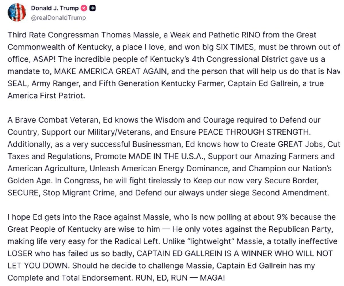* トランプ氏、エプスタインのファイル公開を望む唯一の共和党下院議員を攻撃 現時点では、トランプ氏はミリアム・アデルソン氏の代弁者のように聞こえるだけでなく…彼自身が代弁者なのだ。彼は、議会で数少ない買収されていない人物の一人であるトーマス・マッシー氏を攻撃している。 x.com/goddeketal/sta…