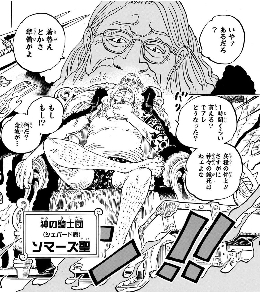 ONEPIECE エルバフ編 ソマーズ聖 (なんだ 休暇だぞ おれは) ガーリング聖 (エルバフへ迎え) ソマーズ聖 (ん!? ちょっと待て) ガーリング聖 (すぐ行けるだろ) ソマーズ聖 (いやァ あるだろ) ソマーズ聖 (着替えとかさ 準備がよ) ソマーズ聖 (もしもし!? ガーリング!) pic.x.com/kQGgvzEZWa