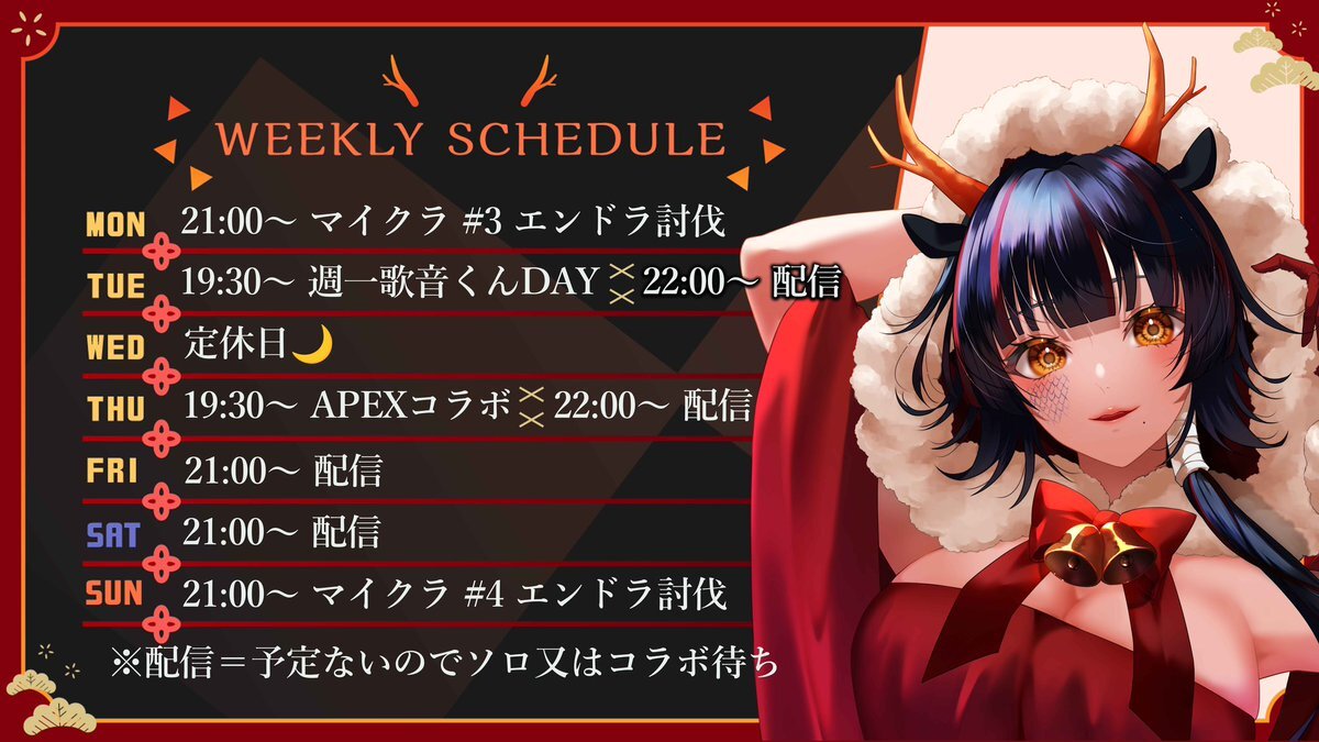 🗓12/1~7の配信スケジュール🗓 👤コラボ👤 (月)➽マイクラ初心者エンドラ討伐 (火)➽週一歌音くんDay (木)➽APEXコラボ (日)➽マイクラ初心者エンドラ討伐 🌙休み🌙 (水)➽定休日 🎬動画投稿🎬 毎日ショート動画投稿 17:00 動画投稿 19:00 🎮配信🎮 Delta Force, EFT, ARC Raiders, APEX